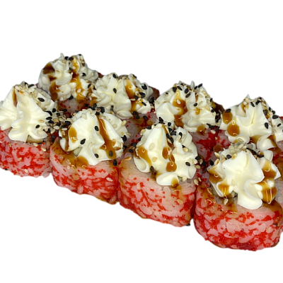 мясо краба (имитация), сыр, огурец, японский омлет, масаго, соус кабаяки, кунжут, рис, нори